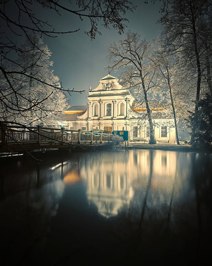 Perła Założenia Willowego w Zwierzyńcu w zimowej scenerii